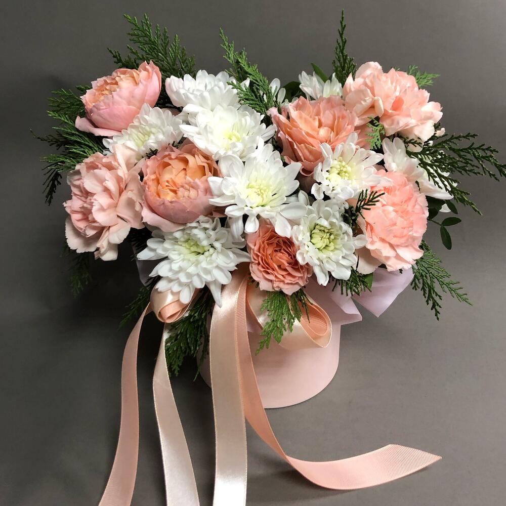 Нежный букет в коробке из свежих пионовидных персиковых роз сорта Джульетта и крупных диантусов. Яркая зелень туи добавляет букету зимний колорит 💐